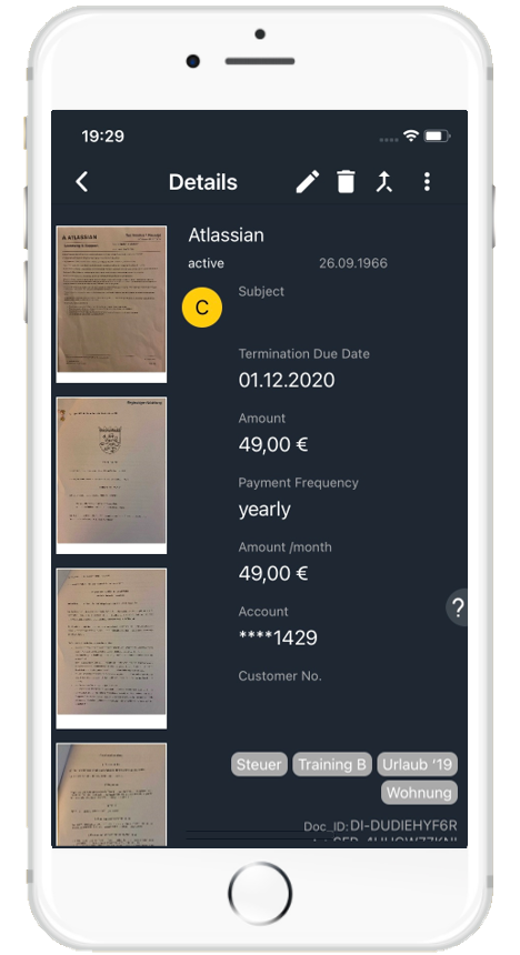Haben wir das Dokument verstanden, können wir es entsprechend in der App anlegen. Alle Dokumente werden im Volltext suchbar gespeichert. Wichtige Termine (Rechnung bezahlen / einreichen, Vertrag kündigen...) kommen in deinen Kalender mit Erinnerung.Post-it´s (Tags) werden nach deinen Regeln an die Dokumente vergeben - damit kannst du sehr einfach "Aktenordner" zusammenstellen.