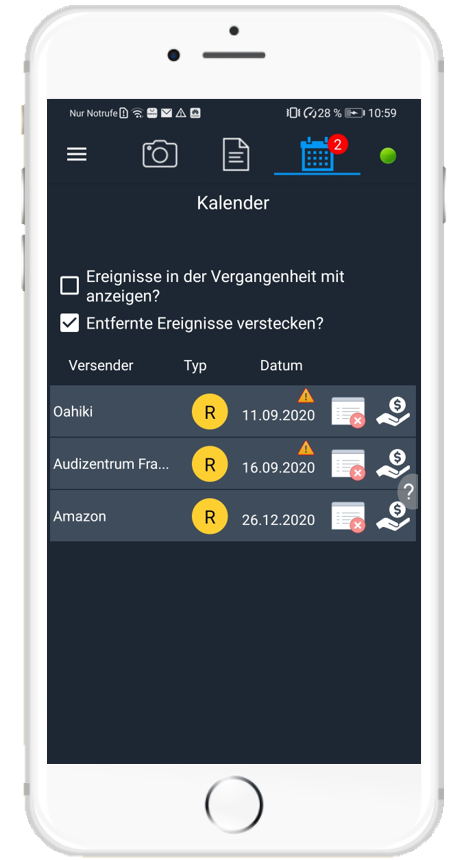 (3) Im Kalender der App liegen du automatisch alle Rechnungen die noch bezahlt werden müssen - wir erinnern dich aber auch!