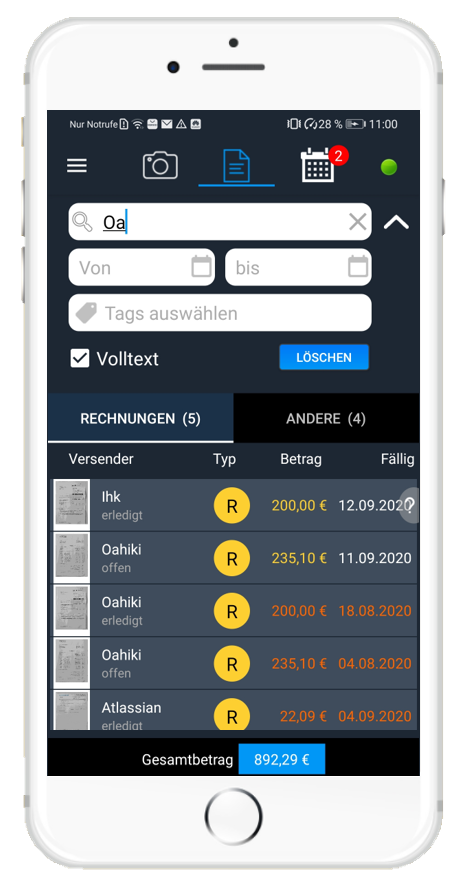 Über die integrierte Kamera kann jedes Dokument aufgenommen werden. Aus z.B. e-Mails können auch elektronische Dokumente (PDF, Word) geladen werden: mit der Oahiki App kannst du Dokumente teilen / sharen.Auch mehrseitige Dokumente sind kein Problem - das erkennt die App von alleine.